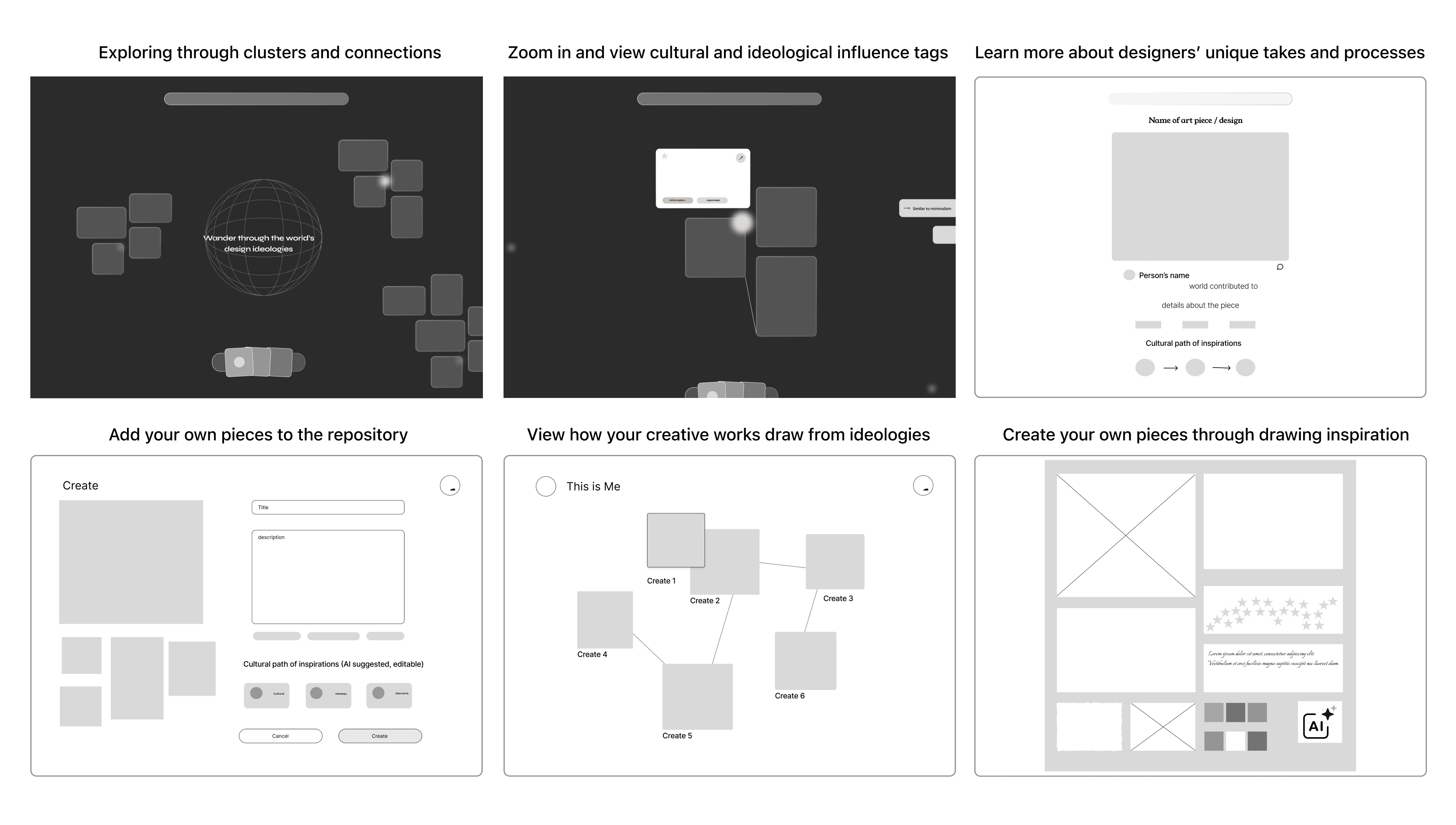 We transformed our initial sketches into medium-fidelity wireframes to support the unique user flows which encapsulate exploring works, learning more about the cultural values that shaped them and allowing users to see how their own creative voice is being shaped by ideologies.