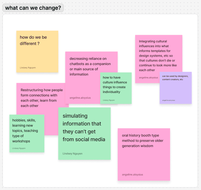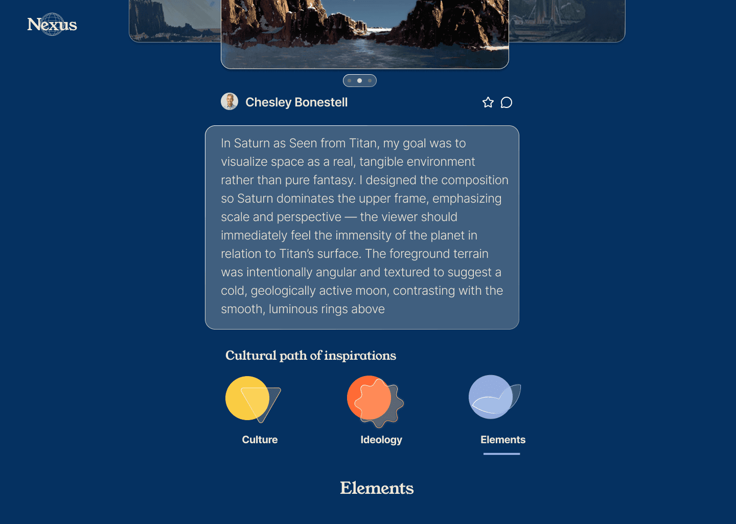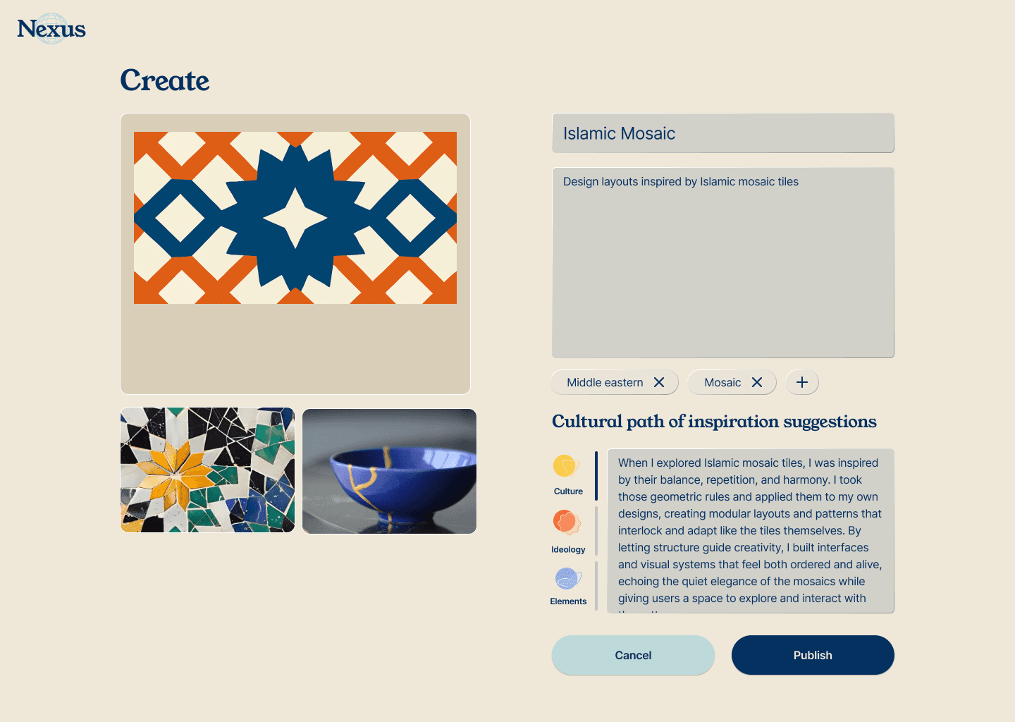By providing designers with these tools that encourage cultural exploration and self-reflection, Nexus helps reduce the reliance on AI-generated trends and re-centers human intent and identities in the creative process. This allows designers to think critically, create consciously, and make their own creative decisions. This allows for people to express their individuality through their creative work more effectively. By helping people become more informed creatives, we can ensure culture and shared communal knowledge is being preserved and not lost within trends, allowing for more representation in design overall.