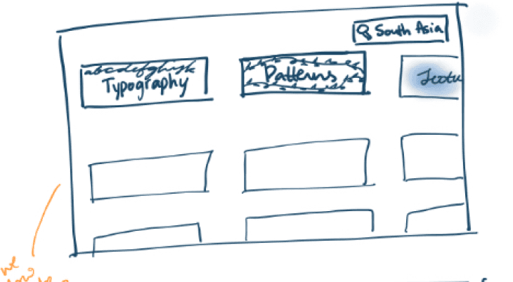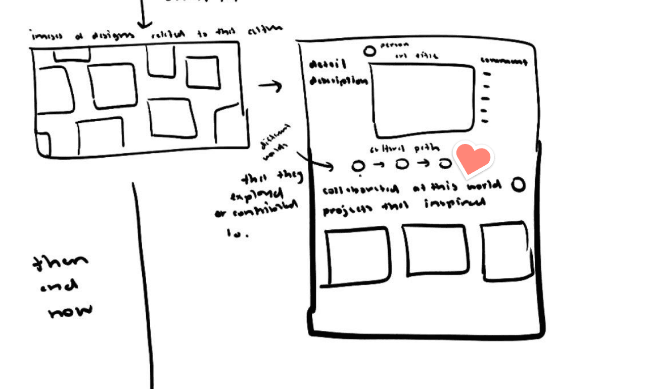 We sketched 4 unique user flows for the product, allowing designers to tap into the creative legacy of various communities through exploring artwork and designs freely or searching for specific interests. Users could showcase their design stories and AI will help them find inspiration to draw from design ideologies and cultural values that they may not previously have considered. At the end, we merged our highlighted pages and combined them into one coherent experience.